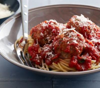 Return the meatballs to the sauce, cover, and simmer on the lowest heat for 25 to 30 minutes, until the meatballs are cooked through. Serve hot on cooked spaghetti and pass the grated Parmesan.