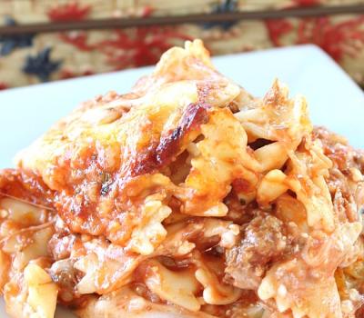 Preheat oven to 350° and spray a 13 x 9 baking dish with a non stick spray. Set aside.In a large skillet, cook ground beef and onions over medium heat.