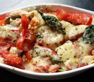 Preheat oven 350 degreesHalve the tomatoes, brush on olive oil and sprinkle basil leaves on top. Place shredded mozzarella cheese on top.