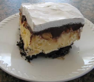 Slice vanilla ice cream into 3/4 inch slices, and place them in a single layer over the chilled crust. Smooth the seams. Sprinkle the peanuts over the ice cream. Top with the cooled chocolate sauce. Cover and freeze 8 hours or overnight.