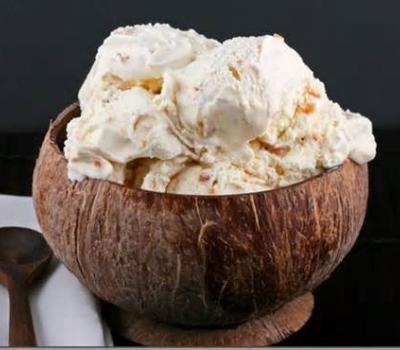 Bring milk, heavy cream, coconut milk, and coconut flakes to simmer in heavy saucepan for a few minutes. Allow to steep for 10 minutes.
