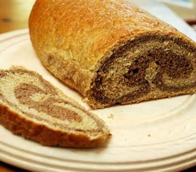 Remove both of the doughs from their bowls and invert them onto two separate lightly floured surfaces. Pat each dough into a rectangle about 3/4-inch thick. Place the pumpernickel rectangle on top of the rye dough rectangle. Roll up the dough, beginning with the long side and stopping after each full turn to press the edge of the roll firmly into the flat sheet of dough to seal. Press with your fingertips. Tuck and roll so that any seams disappear into the dough and place on a parchment lined baking sheet. With a pastry brush, brush the beaten egg evenly over the bread. Cover with plastic wrap and set aside in a warm, draft-free place until it doubles in size, about 1 hour. Bake until lightly brown, 30 to 35 minutes. Remove from the oven and cool on a rack.