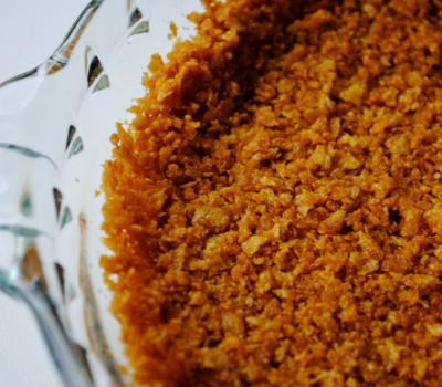 Add sugar and butter to crushed cornflake crumbs. Press evenly and firmly into the sides and bottom of a 9 inch pie dish. Bake at 350 degree for about 8 minutes and let cool before adding filling.Quick Cornflake Crust Pie, 1950`s Recipe