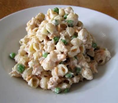 Cook the salad macaroni according to package directions, drain and cool completely. Cut the cheese into small cubes. Drain or thaw the peas. Drain the tuna and flake it into fine pieces. Combine all the ingredients and add Miracle Whip or mayonnaise to tasteMY NOTES