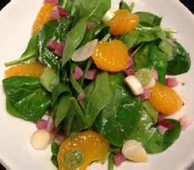 In frying pan, heat 3 T. sugar over med-low heat until melted (sugar turns liquid). Sprinkle almonds into sugar and stir to coat (almonds clump together). Pour onto a greased plate and let cool; separate. Tear clean, dry greens into bite-sized pieces. Toss greens with sliced onion rings (reserve some for garnish),drained oranges, and cooled, separated candied almonds.