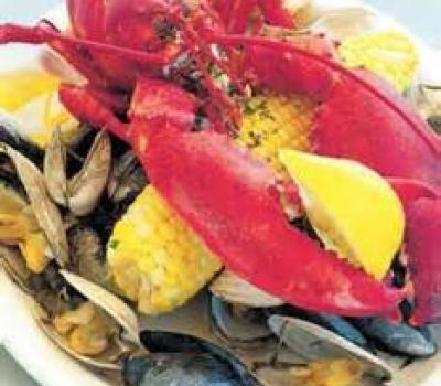Start the fire 1 hour in advance, making sure the coals are white hot before you begin cooking.Spread 1/2 of the seaweed on the bottom of the tub to protect the lobsters from burning. Place lobsters on top of seaweed. Place the corn on top of the lobster, and the potatoes on top of the corn. Arrange the raw clams on top of the vegetables and top with the remaining seaweed. Pour the wine into the tub. Place the wet burlap over the food and tuck the edges into the tub to retain the steam inside.