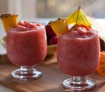 Combine the strawberries, pineapple juice, coconut cream, and crushed ice in a blender and blend until smooth and thick. Serve in a margarita glass or other fun glass and garnish with drink umbrella, whole strawberry, pineapple wedge, and fresh mint leaf.MY NOTES