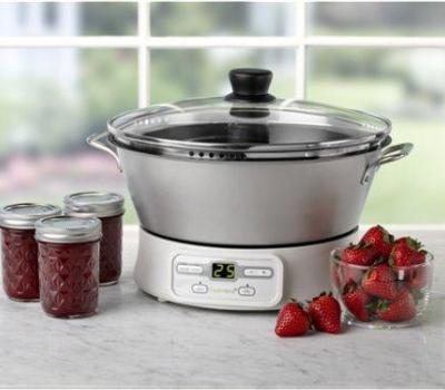 5.THE APPLIANCE will continue to automatically stir your ingredients while it cooks. Stay within earshot of the Jam & Jelly Maker, the appliance will beep again at the end of the process signaling jam cooking is complete. Press cancel, unplug the appliance and immediately remove Glass Lid.