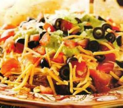 3. Top with layers of cheese, guacamole, tomatoes, onions and olives. Serve with tortilla chips.