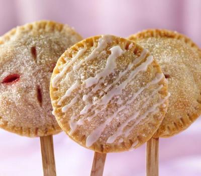 1 Heat oven to 450°F. In bowl, place reserved strawberry juice. In another bowl, mix 1/3 cup granulated sugar and the cornstarch; using whisk, beat into reserved strawberry juice. Stir in strawberries and rhubarb.2 Remove pie crusts from pouches; unroll on work surface. Using 3 1/2-inch round cutter, cut out 16 rounds (8 rounds per crust). Place 8 rounds on ungreased cookie sheet. Spoon strawberry-rhubarb mixture evenly onto each round to within 1/2 inch of edge. Place 1 craft stick in filling of each.