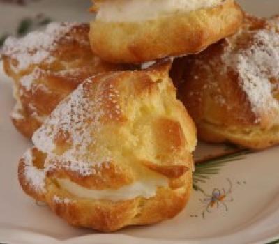 In a saucepan over medium heat, bring water and butter to a boil. Add flour all at once and stir until a smooth ball forms. Remove from the heat; let stand for 5 minutes.Add eggs, one at a time, beating well after each addition. Continue beating until mixture is smooth and shiny. Drop by teaspoonfuls 2 in. apart onto greased baking sheets.