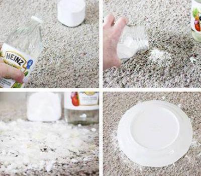 Pet potty spots on the carpet. I use good old vinegar and baking soda. The steps are the important part. Pour enough vinegar to soak the stain and THEN add a small amount of baking soda. If you do the reverse, you will have a noisy, bubbly mess. Do it the right way, and you can hear the recipe cackling away, telling you how it is cleaning and deodorizing without leaving any residue. You need to let the spot dry for a day or two before sweeping up and then vacuuming. We cover the spot with a bowl or plate so that we don’t have baking soda kicked from heck to breakfast. You can actually see the yellow color being absorbed up into your little mountain of baking soda. Works on old stains too!MY NOTES