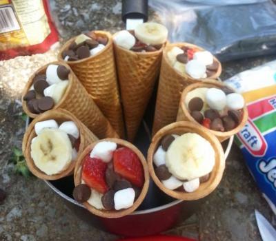 Try this at your BBQ's this weekend: Waffle cones with marshmallows, chocolate chips, bananas, and strawberries. Wrap in tinfoil and throw on the fire or