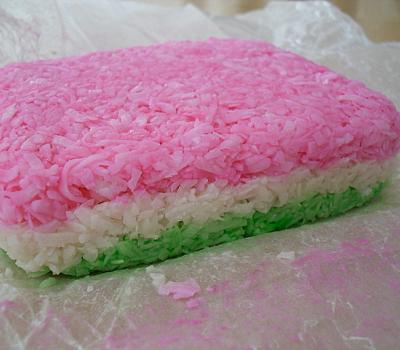 This is a soft and chewy coconut candy that is very easy to make. This is different from the hard coconut candy with bright coloring (from Malaysia). Instead of making it tricolored, you can shape each color into a ball (wear plastic glove) and serve it individually. I think it would help in tasting the different flavors of the candies. I found that when combining the three, I couldn't taste the individual flavor as the rose paste seem to be over powering the rest of the flavors.