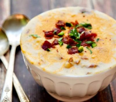 4.Using a potato masher or something similar, crush potatoes to thicken soup, leaving some chunks but allowing some to "melt" into the soup. Stir in cheese until melted and smooth. Add milk, bring back to a simmer and cook for an additional 10 minutes until very hot.