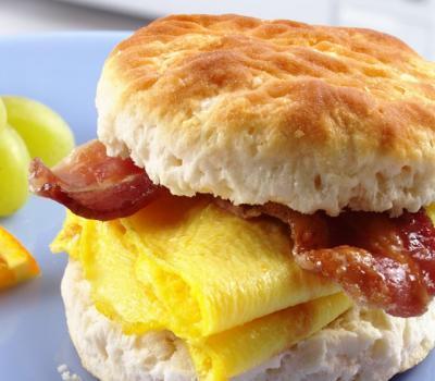 4 Split warm biscuits horizontally; place on 4 individual serving plates. Cut eggs into 4 wedges. Place eggs and bacon on bottom halves of biscuits. Cover with top halves of biscuits.