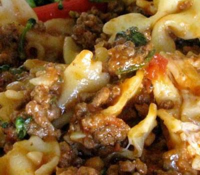 Brown ground beef with onion and garlic. Put in crock-pot and add sauce, tomatoes and seasonings. Cook for 6-7 hours on low.Add the last 4 ingredients during the last 30 minutes of cooking and turn crock-pot to high. I added the fresh spinach, pasta, parmesan and 1 cup of the mozzarella and I mixed it all up really well. Then I added the last 1/2 cup of mozzarella to melt on the top.
