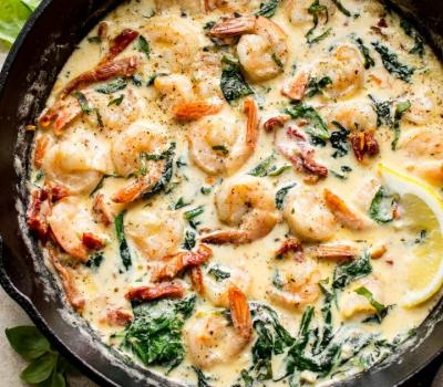 This creamy garlic Tuscan shrimp recipe with sun-dried tomatoes, spinach, and basil is rich, decadent, and ready in about 15 minutes! Great served over pasta or mashed potatoes.