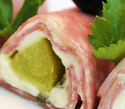 "Yummy ham, pickle and cream cheese roll ups for an appetizer or a party! Secure the roll ups with toothpicks, and cut them into bite size pieces."