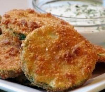 To serve, spoon hot spaghetti sauce onto plates, and top with fried zucchini slices and melted cheese.