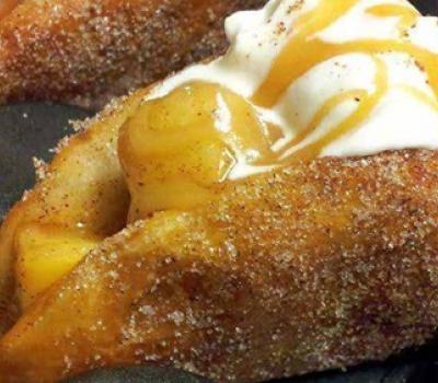 Fill taco shells with apple pie filling and top with whipped cream, and sprinkle a little more of sugar-cinnamon mixture on top.