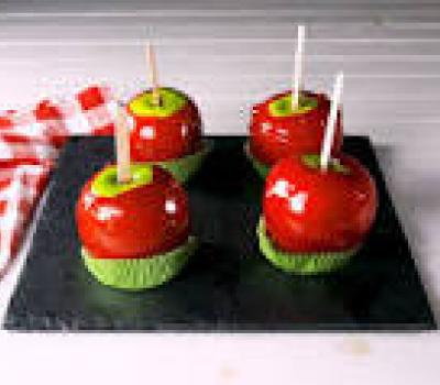 Insert a wooden stick into the top of each apple, pushing about halfway through. Set aside.