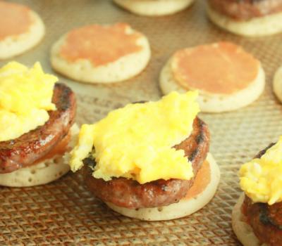 Frozen mini pancakes, brushed with a maple and butter mixture, hold together the warm sausage patty and scrambled eggs. So simple but your family will love them.