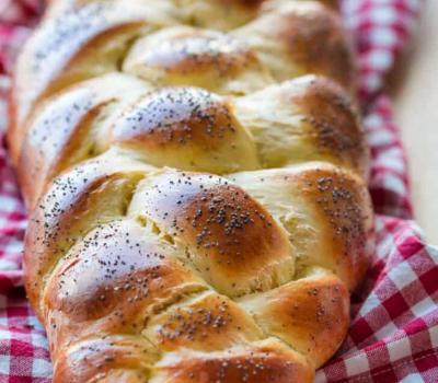 In a separate dish, beat together 1 egg and 1 tsp water. Once the braid has puffed up, brush with egg wash and sprinkle on poppy seeds if using.