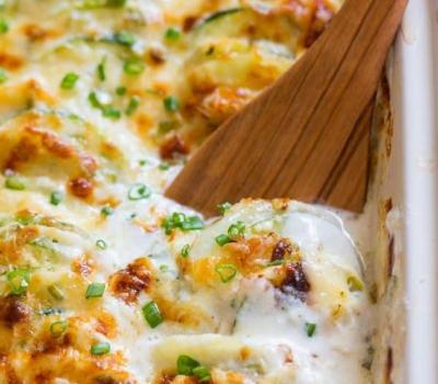 This zucchini potato bake is creamy and cheesy with a sauce tastes like garlic alfredo. This potato bake has simple ingredients and iit comes together quickly.
