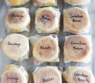 Top each English muffin half with egg, cheese, meat, and the other half of the muffin. If you are consuming right away, heat the sandwiches at 350 degrees for about 5 minutes or until the cheese melts.