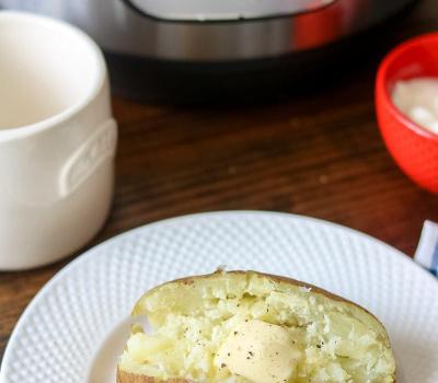 Place 1 cup cold water in the inner pot of pressure cooker pan and place trivet in instant pot. Note: Use 1.5 cups of cold water in an 8-quart Instant Pot.Scrub potatoes well and then pierce potatoes 5-6 times with a fork to allow pressure to release while cooking.