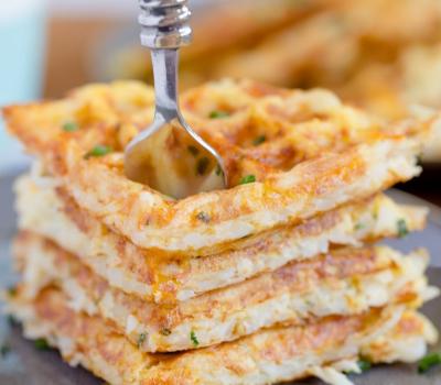 Heat waffle iron on the medium-high setting. Spray each side generously with non-stick cooking spray or brush with melted butter.In a medium-sized mixing bowl, whisk together eggs and milk. Stir in potatoes, cheese, chives and season with 1/2 teaspoon salt and 1/4 teaspoon pepper.