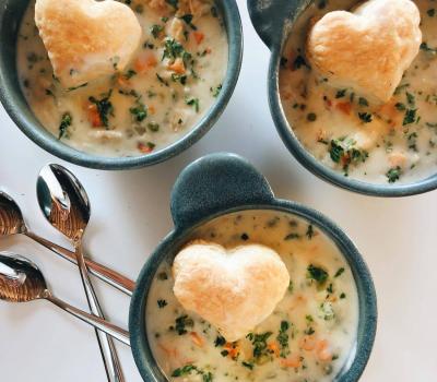 Slow Cook: Place the chicken, salt and pepper, onion, garlic, rosemary, thyme, broth, potato, and pea/carrot mix in a slow cooker. Cook on high for 3 hours. Remove the chicken, shred, and return to pot. Remove the herb sprigs and discard.Make it Creamy: Whisk the flour and cream together until smooth. Add to the slow cooker. Keep on high heat for another hour or so. For a thicker soup, whisk the cornstarch with a little bit of cold water and add it to warm soup in the slow cooker.