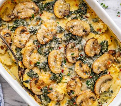 CHEESY MUSHROOM RAVIOLI CASSEROLE WITH SPINACH
