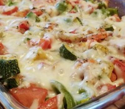 In the prepared casserole dish, mix the zucchini, onion, tomatoes, and green pepper. Season with Italian seasoning, and top with cheese.