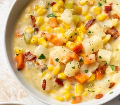 This corn chowder recipe is loaded with sweet corn, the bacon adds smokiness, and you will love how creamy and flavorful it is!