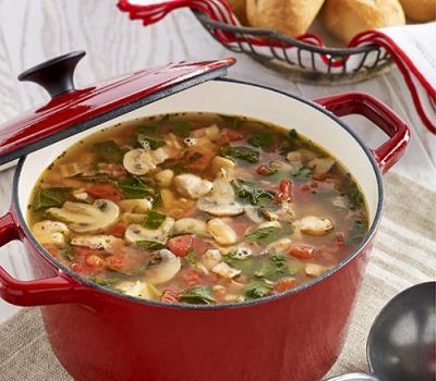 Chicken soup recipe with cannellini beans, mushrooms, seasoned tomatoes, baby spinach and bacon
