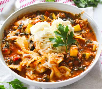 What’s better than baked lasagna? Lasagna in a bowl! This Slow Cooker Lasagna Soup is packed with tender ground beef, crushed tomatoes, zucchini, spinach and bow tie pasta. Topped with a dollop of ricotta and sprinkle of mozzarella — you’ve got yourself a delicious, cheesy weeknight meal!