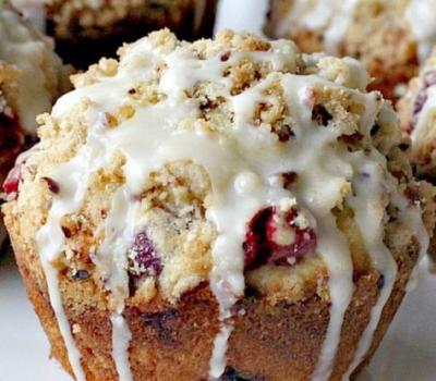 These lovely muffins have super humongous muffin tops and are incredibly festive and beautiful. Filled with cranberries, orange juice and zest and pecans, with a delightful streusel and orange glaze, they make an amazing holiday breakfast.