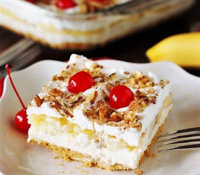 No-Bake Banana Split Cake has all the fabulous flavors you'd expect from a scrumptiously melty banana split sundae, all in an easy to prepare no-bake dessert. Complete with maraschino cherries on top of course, because it wouldn't be a banana split without a cherry on top!