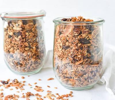 In a large bowl combine oatmeal, coconut, almonds, pecans, cranberries and brown sugar. Stir to combineIn smaller bowl combine maple syrup, water, melted coconut oil, salt and vanilla.