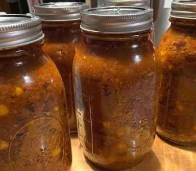 Chili with meat and/or beans will require 1 hour and 15 minutes for pints, 1 hour and 30 minutes for quarts at #10 of pressure.