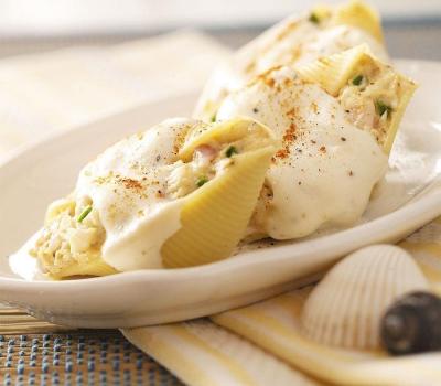4. Preheat oven to 350°. Drain and rinse pasta; stuff each shell with 1 rounded tablespoon of seafood mixture. Place in a greased 13x9-in. baking dish.