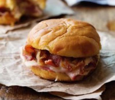 Preheat the oven to 350 degrees. Cut foil into large squares for wrapping each sandwich. Brush the bottom of each bun with butter mixture on both sides. Top with ham, onions, bacon, and cheese. Brush the top of the bun with butter on both sides, place on the sandwich, and wrap with foil. Repeat for remaining sandwiches. Bake for 20 minutes or until warmed through and cheese is melted. Store leftovers in the fridge with a piece of wax paper between them to prevent sticking. Reheat leftovers in the oven wrapped in foil or in the microwave for 1 minute.