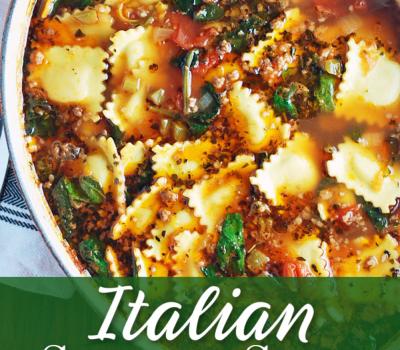 A hearty and delicious recipe for Italian Sausage Soup made with Italian sausage, fresh ravioli pasta, vegetables, and seasonings.
