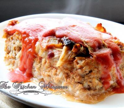 If you using a standard size pan (not deep dish) cover with 2 layers of cabbage leaves and top with the remaining can of soup. If using a deep-dish pan, add a single layer of cabbage and the remaining meat following by the rest of the cabbage leaves. Be sure to leave enough leaves to cover the top. Cover with the remaining can of soup and spread out evenly. Spray the underneath of a large piece of foil. Place foil side down on the pan and close tightly around the dish. Place the pan on a larger cookie sheet to catch any spillovers. Bake for 3 – 4 hours or until the cabbage is tender when pierced with a knife.