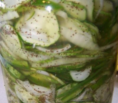 Slice the veggies into 2 quart jars, I like to make layers of them: you can leave out the onions and peppers, if you want, but they are so good!~Mix your other ingredients in a large measuring cup, stir well. The sugar will not be dissolved yet~Pour over sliced vegetables, evenly in each jar~You will finish filling the jars with cold tap water~I shake the jar a few times during the 24 hrs to mix~No need to cook it~ Ready to eat in 24 hours. Taste best if eaten within a week or two~but I like to add tomato wedges or slices to this liquid for overnight, when it is close to empty of veggies~Use the next day~Unbelievable with sandwiches~~I have also pickled hot peppers using a batch of this same liquid~They are delicious!