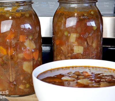 Prepare jars. Using a slotted spoon or similar, fill the jars half-way with solids (meat, vegetables). Then fill the jars the rest of the way with liquid (broth), making sure to leave 1 inch of headspace.