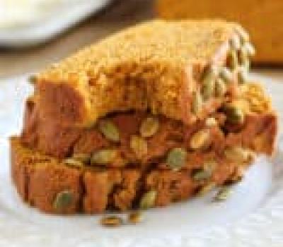 In a separate bowl, whisk sugar, syrup, egg whites, pumpkin, oil, and water until well combined. Add the wet ingredients to the dry ingredients and stir until combined. Be careful not to over mix. Pour the batter into prepared pan and sprinkle pepitas over the top. Bake for approximately 40 minutes, until a toothpick inserted into the center comes out clean.