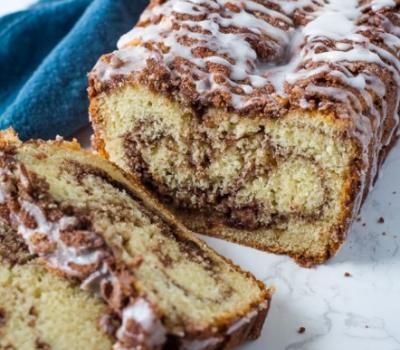 This cinnamon roll quick bread is soft and moist with a brown sugar cinnamon swirl and a crunchy streusel on top.